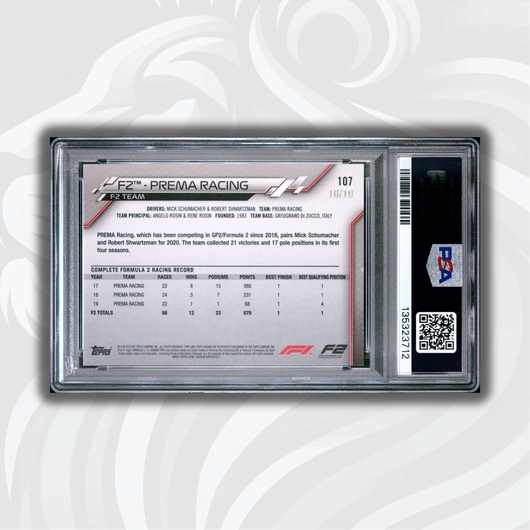 Prema Racing, which has been competing in GP2/Formula 2 since 2016, pairs Mick Schumacher and Robert Shwartzman for 2020. The team collected 21 victories and 17 pole positions in its first four seasons.