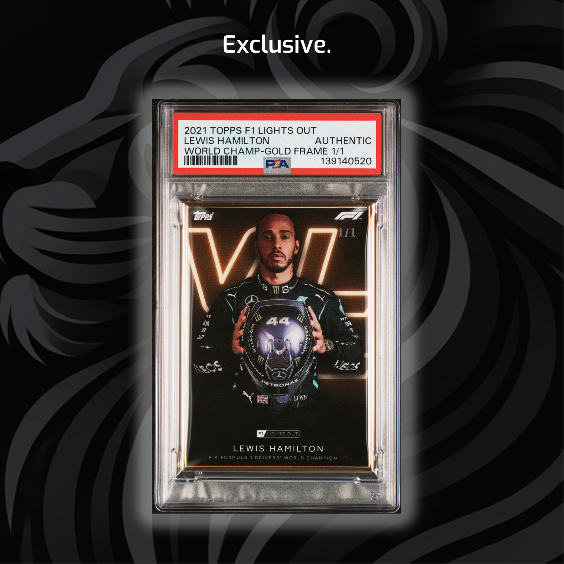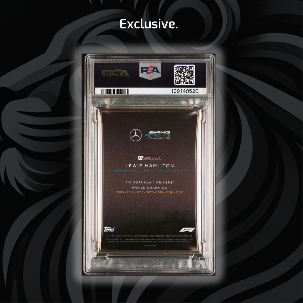 The first-ever Lewis Hamilton #44 Helmet Gold Frame! Part of the very first Topps Lights Out set that hit the market back in 2021. The card celebrates Lewis as 7-time World Champion. The card was front and center in all Topps promotion around the set. Most probably the most beautiful and unique Lewis card in existence....