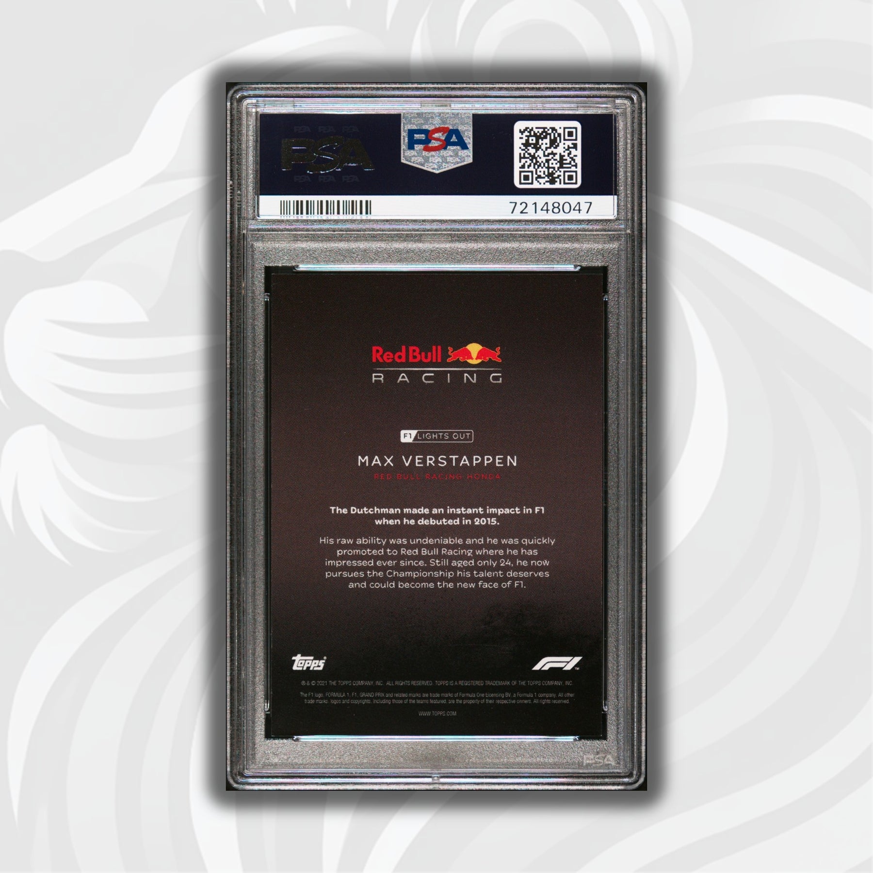 This card is part of the very first Topps Formula 1 Lights Out series that consists of a collection of 40 cards only. It sold exclusively online at the end of the historic and controversial 2021 season.
